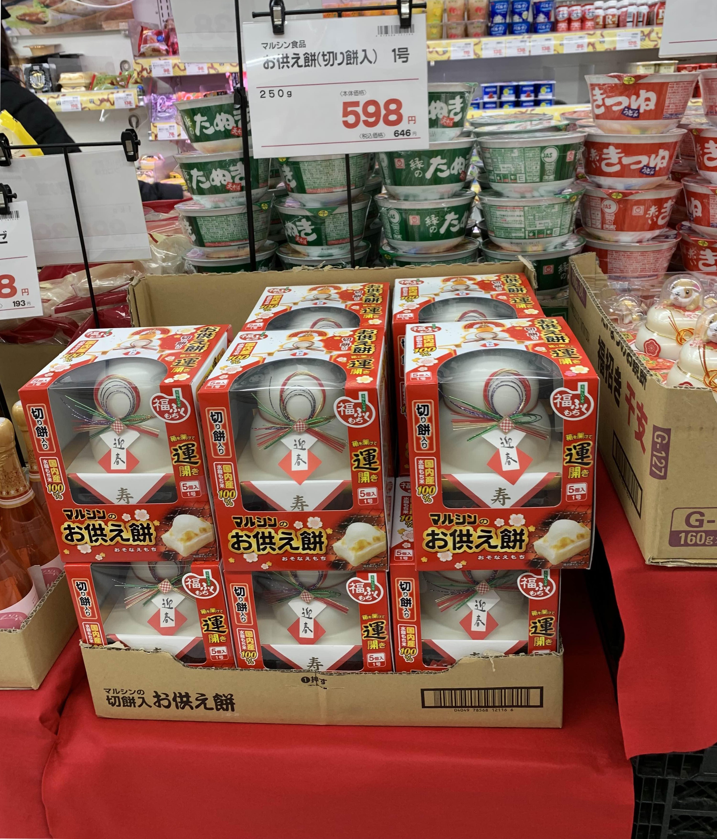 집에서 직접 동그란 모양의 키리모찌에 금귤로 장식해서 두는 게 정석인데 요즘에는 이렇게 마트에서 파는 카가미모찌를 사다가 집에 장식하는 경우도 많다.